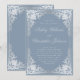 Denna eleganta dammiga blå och silver bröllopsinbjudan med vintage-känsla har allt: "något gammalt, något nytt, något lånat, något blått". Den vintage utsmyckade falska silverramen är "lånad" från ett gammalt bokomslag, av Georges Mercier (1885-1939): Madame de Maupin av Theophile Gautier, utgåva 1911, nu i public domain. Den blåa bakgrunden har en ny, modern nyans som heter "dusty blue".