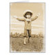 3D-digital återgivning av en söt vintage-pojke som körs på himlar och byggnad i storstadens bakgrund, retro, gammal fotoeffekt