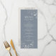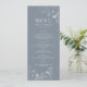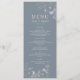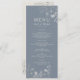 Vintage, boho, meny för blommigt dammigt blått bröllop med elegant periwinkle och enkelt handskript.