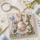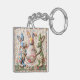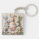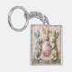 Decorative Print Keychain featuring vintage Easter bunnies in quilted patchwork print design. Three adorable fabric-style rabbits with Easter egg basket printed image. Cottage core shabby chic aesthetic. Nostalgic vintage charm print.