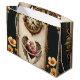 Vintage elegance: an elegant clock and heart. The focal point is a vintage clock with Roman numerals in an elegant gold tone. A winged heart, radiating in vibrant red, is adorned with gold accents that emphasize its contours and lend it a sophisticated shine. The heart's wings are richly detailed, with finely crafted gold feathers that radiate upward, lending the motif a dynamic lightness.