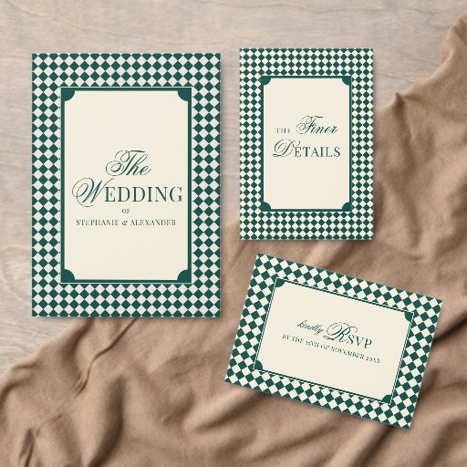 Vintage Emerald Checkered Old Money Photo Wedding Inbjudningar
