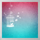 En illustration av vintage stil med en teckning av en vit fågelburk och en liten fågel sitta inuti med dörren öppen. Många fåglar flyger runt utanför. Bakgrunden är en övertoning av blå grönt som blandas i lila och rött.