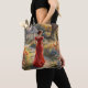 En väska med en bra konst av en elegant dam i en lång röd klänning i en sommarträdgård med blommor. En vacker imponerande stil-gåva till hennes födelsedag eller tillfälle.