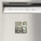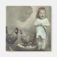 Vintage Magnet av en liten flicka som står med tupp och kyckling med kycklingen som lägger ovanpå äggen.