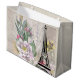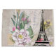 En presentpåse med en söt kollage av målade blommor och postmärken för vintage med en svart illustration av eiffel torn. Charming- och chic-design. Efterbelys bild för bakgrunden.