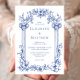 Den här vintage-inspirerade bröllopsinbjudan innehåller en gräns av klassiska kolumner och blommigtens motiv i blått på vit bakgrund. Parets namn visas i klassiskt serif-teckensnitt, med resterande text i kursiv stil.