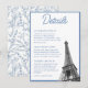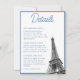 Dela din evenemangsinformation med stil med dessa vintage franska Eiffeltornet Bat Mitzvah detaljer bifogas kort. Designen har en blå toile blommig design på baksidan med ett Eiffeltornet-foto och personlig text för att dela detaljerna om ditt evenemang på framsidan. Gå in i Zazzle Design-verktyget för att göra ytterligare justeringar.