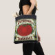 Fin tote bags som är övertryckt! Finns i två stilar och två storlekar! Vintage illustrerar reklam för frukt på låda-etiketten med en stor röd, mogen ekologisk tomat på vinerna. Retro-reklam för tomater som är konserverade under varumärket Defender.