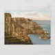 Vykort med vintage fotolitografi av Pleaskin Head, Giant's Causeway, Irland från 1895 bilder dramatiska markutklippningar. Digitalt rengjorda, förbättrade och artificiellt återgivna för att likna penna och bläck med vattenfärger. Giantens Causeway ligger i grevskapet Antrim på Nordirlands nordöstra kusten, ungefär tre miles nordost om staden Bushmills.