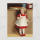 En liten flicka, som bär en röd klänning och vit pinafor, håller en träsked medan hon tittar på två stora pumpa paj. Partiell bild av ett vykort för Vintagens Thanksgiving av Ellen H. Clapsaddle.
