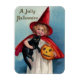 Vintage bild av en liten flicka häxa, som håller hennes svarta katt och en pumpa, med önskemål för "A Jolly Halloween", finns på den här magneten. Gör en underbar gåva till Halloween fest, födelsedagar eller för att dekorera ditt hem!