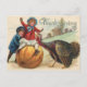 Önska dina vänner och familj med denna eleganta vintage barn pumpa leker med kalkon bild Glad Thanksgiving hälsning vykort. Personifiera önskningstexten för att skapa en minnesvärd högtidssak.