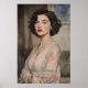 Den här fängslande vattenfärgen porträtt utstrålar ett luft av obestridlig allure och tidlös glamor. En vacker ung kvinna, hennes kort mörk hår som tränar in i hennes ansikte, är skild från stående sidled, hennes huvud vände sig något för att möta konstnärens (tittarens) blickar. Hon bär en elegant lågskuren, gräddklädd färgad med en subtil mönster. Hennes ögon är intensivt engagerat, kompletterat med ruttna kinder och träffande ljust röda läppstift, som skapar en bild av självsäker, fängslande charm. Biet är ett firande av fetstilt feminitet och magnetisk närvaro.