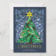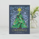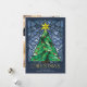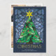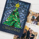 De här klara och färgstarka 5-tums x 7-tums platta julhälsningskorten har en handgjord glasruta av nedfläckad med vattenfärg från en grönt Julgran med guld-stjärna och röda prydnadsföremål som är inramade i blå nyanser på marin blå bakgrund. Hälsning är "jul" i ett stort dekorativt brev med ett redigerbart hälsning, "önskar dig fred, kärlek och glädje denna julhelg". Kortets baksida har en plats för tre av dina favoritfoton med platshållare för ditt namn och år.
