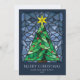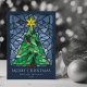 De här ljusa och färgstarka 5-tums x 7-tums platta julhälsningskorten har en handgjord glasruta av nedfläckad med vattenfärg från grönt Julgran med en guld-stjärna och röda prydnadsföremål som är inramade i blå nyans. Det redigerbara hälsningen är "God jul," med platshållare för ditt namn och år. Baksidan har det redigerbara budskapet: "Önskar du fred, kärlek och glädje den här julhelgen."