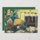 Vintage illustrerar God jul helgdag-scenen med ett insida-rum av ett hus. Ett vardagsrum med ett dekorerat Julgran, ett lager som hängdes av kaminen, ett mellanmål och brev lämnat för Jultomten och familjejordarna (en kattunge och en valp hund) som somnade tillsammans på soffan och väntade på tomten.