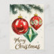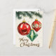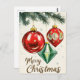 Julvykortet innehåller tre pulserande prydnadsföremål som hänger från snö-dammad, vintergrön grenar. Två dekorationer är klassiskt röda med glansigt avslutat, medan det tredje är en grönt med diamantformad dekoration. De röda prydnadsämnena är ett runt boll med små stjärnliknande gnistor och ett annat med en droppform, dekorerad med cirkulärt mönster. Under dekorationerna skrivs ord "God jul" i en elegant som glittrar guld. Bakgrunden är lätt sprinklad med små stjärnor och snöflingor, ge vykortet en festlig och glad helgdag.