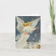 Vintage illustrerar julbilden med en flygande Victoriansk ängel som tappar ro på ett vinterklot i snö.