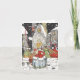 Vintage illustrerar julbilden med en grupp människor i stan som går till kyrkan på en snöjul Kväll. Texten lyder: Säsongens hälsningar.