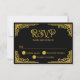 A matching RSVP card designed in the Cinematic Vintage style and gold and black with subtle filmgrain/dust overlay. Completes your editorial wedding suite with a cohesive, nostalgic look. Fully editable. The card has rsvp circles,a decorative frame and vintage font in faux gold.