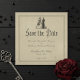 Announce your special day with this elegant vintage gothic design with a vintage skeleton bride and groom scene. This unique aged parchment style wedding save the date card is perfect for couples seeking a sophisticated, classic, or dark aesthetic for their memorable celebration. Fully customizable, it sets a dramatic, vintage aesthetic and darkly romantic tone for your ceremony. Created by Simply Farmhouse Press.