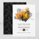 Vintage orange och svart blommigt gothic Halloween-temed bröllop spara datum inbjudan anpassade till dina specifikationer. Om namnen ser lite ocentrerat ut när du anger det, "Klicka för att anpassa ytterligare" (den blå länken grund i "Anpassa den här mallen") för att enkelt justera i designområdet.