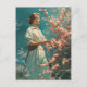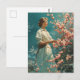 Brevkortet har en tidlös scen där en kvinna står på ett beundransvärt sätt bredvid en blommar för körsbär från petite träd. Hennes attityd avspeglar den elegans som eran har och de känsliga blommarna för rosa skapar en verklig bakgrund som fångar kärnan i en förlegad era.