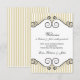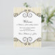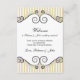 Det här bröllopshälsningskortet har en ljus guldrandig bakgrund med solida svarta vintage-järngrindssnörklar överst och längst ner. Designen ger kortet en mycket elegant look. Anpassningsbar text låter dig lägga till ditt eget meddelande till dina bröllopsgäster utanför stan.