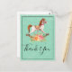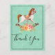 Tack-kort med en charmig och fantasifull bild av en gammaldags gunghäst med en fin blomsterbukett i rosa och gult. Bakgrunden är ett ljust grönt shabby damastmönster. Personligt meddelande på baksidan.