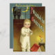 Vintageillustration Halloween-helgdesign med ett ungt barn som är rädd för den mörka natten. Det finns en klassisk svart katt och halvmåne i fönstret och han tappade sin bok med läskiga historier. Ett ljus står på det lilla bordet. Halloweenhälsning. Ellen Clapsaddle.