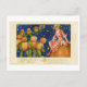 Detta vykort är en återgivning av ett vykort av vintagen Halloween som har jack-o-lyktor i en linje och en kvinna sitta på en pumpa.