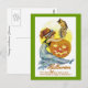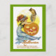 Vintage Halloween-hälsningskort med en kvinna som tittar in i spegel över en Jack o'Lantern med texten "Om du ser älskare i spegel är du säkert lycklig på halloween."