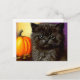 Vykort med vintage Halloween-kattunge! En flytande svart kattunge står bredvid pumpor mot lila bakgrund. En roligt för Halloween fest och kattälskare!