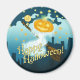 En bild som hämtats från vintage Halloween-kort, det här söta spöket har ett pumphuvud och kör en bomme mot himlar nattetid med texten "Happy halloween".