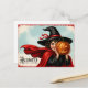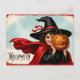 Det här är ett vykort för vintage-stil Halloween med vågrät orientering, designat att se åldras med ett stressat rött gräns. Subjekt är en ung flicka som är utklädd till häxa och som håller en karvpumpare. Flickan har mörk, klåda och en blek med rosiga kinder. Hon bär en stor, spetsig svart häxhatt med ett rött band och ett omfångsrikt rött skrapa runt sina axlar. Hon tittar på tittaren med ett fegt leende. Hon har ett klassiskt jack-o-lanternt med triangulärt ögon och en vidsträckt, malande mun. Pumpen är tänd inifrån och ge av en varm glöd. I bildens grund-lämnat hörn skrivs ord "Hallskulden" i ett dekorativt, gotiskt stil-skript. Bakgrunden är en mjuk, ljusblå nyans med moln. Hela bilden har ett texturerat utseende med hand-färgad, ge det en charmig och nostalgisk känsla.