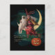 Vintage Halloween-vykortsdesign. Konstruktionen har en vintage Halloween-häxa och uggla sitta på måne. Häxan håller en Halloween Jack o lantern. Halloween-vers säger: "När uggla och häxan ses, så brinner det på Halloween".