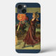 Vintage illustration Halloween-helgdag med en söt, lycklig danshäxa. Flickaktigtens häxdansare är med en bom med ett leende jack-o-iltern-pumphuvud. Det är en dans Party!