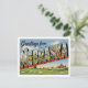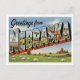 Detta är ett klassiskt vykort vintage-stil med texten "Hälsning från Nebraska". Det stora, stiliserade brev i NEBRASKA innehåller var och en en unik scen eller milstolpe från staten, inklusive det statliga huvudstad, jordbruksmark på landsbygden och det historiska byggnad. Förgrundsbilden visar en pastoral scen där får betar i grönten fält. Utformningen har en nostalgisk känsla i mitten av århundradet med sin eftertro-färg-palett och fet stil, skapar perfekt för produkter som vykort, poster och t-shirts för alla som kärlek vintage resor eller det vackra Nebraska-området.
