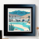 Handflatan Vår liv. Vintage Handflatan Vår. Vattentärsfärg i ett modernt hem i det gamla Handflatan Vår. Vita stuckshus med en fri bassäng-form bassäng. Blått och vitt.