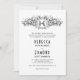 Vintage heraldisk vapensköld med initialer bröllopsinbjudan. Den har en svart och vit blommigt ram med ditt monogram i en heralisk vapensköld och blommor, löv och granater. Baksidan är täckt med svart och vit polka punkt mönster.