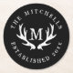 Vintage hjort antler bröllopsfest papper underlägg. Svart och vit jakttematdesign med rustik typografi och logotyp. Lägg till din egen familj namn, giftermål och brev i vapenskölden. Kassera underlägg för nyfödda, gifta par, brudar och brudar, make och hustru, sysselsatta människor osv. Underbar för giftermål, förlovning, möhippa, årsdag osv. Skapa dina egna party-tillbehör och tillbehör. Del av matchande samlingsuppsättning.