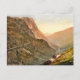 Ett vykort med en vintage fotolitografi av Honister Pass i Sjö District of England från 1895, ett brant bergspass med en lindrig väg och hästdragen transport. Digitalt rengjorda, förbättrade och artificiellt återgivna för att likna penna och bläck med vattenfärger. Honister Pass når en höjd av 1 167 fot och är ett av de högsta i Sjö-distriktet.