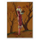 Vintagens teckningar av Tito Corbella har en höstscen med ett modernt dam på 1920-talet med ett vackert rött passande som jackar med vit päls-trim runt hem, handklovar och halsband. Hon har en röd täckhatt och högklackskor. Hon står utanför på en falldag framför nästan obarmhärtigt träd där det sista höst löv av säsongen faller. Konstnären Tito Corbella (1885-1966) föddes i Pontremoli, Italien och dog i Rom, Italien. Han skrev under sin teckning som "T. Corbella" och var mest berömd för sin italienska konst deco stil. Hans kärlek om vackra kvinnor, mode och glamor är uppenbart i de mer än 300 bilder han målade, som ofta användes på vykort. Det här kortet är tomt för ditt eget meddelande.