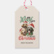 I julfest med VINTAGE PET-taggar med vintage återförebild av tre Labrador Golden Retrievers i Santa Hats och det vismiska citatet "We Woof You a God jul retro vintage font. Lägg till en personlig beröring med ett anpassningsbar på baksidan med hjälp av mallen. ANVÄNDA FÖR DJURLEVER, HUND ELLER KATEGÄGARE, KAT DAM, KAT ELLER HUND PERSONER ELLER NÅGON SOM KÄRLEK HANS HÅRIG FRIEND
