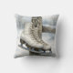 A pair of white ice skates hangs from a rustic wooden post, surrounded by softly falling snow in a serene winter landscape of snow-covered trees, illustrated in watercolor