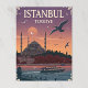 Detta vykort är en vacker illustration av Istanbul, Turkiet, vintage-stil, vid en solnedgång eller skymning. Det skildrar en stor moské med minareter från många, en båt på vatten och fiskmås som sjöng genom himmel. De varma huven i sol och molnen skapar en stark atmosfär och "ISTANBUL TÜRKIYE" står vertikalt på vykortets höger.