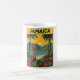 Den här livfulla vintageinspirerade resaffischen fångar essensen av Jamaica, "Tropikernas pärla". Designen visar en fantastisk illustration av en kvinna i traditionell klänning, med en korg tropisk frukt i balans på huvudet medan hon går längs en orörd strand. Frodiga röda liljor och annan tropisk växtlighet inramar förgrunden, medan två majestätiska palmer reser sig mot en strålande gul och orange solnedgång. I fjärran möter det turkosa Karibiska havet en lugn strandlinje, med de frodiga, gröna bergen på ön i bakgrunden.