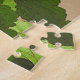 Pussel i en vintage Japansk illustration av en enda rosa vattenblomma, accentuerad med vitt, och löv i emerald och kalkgrön, på en beige bakgrund, digitalt förbättrad