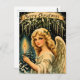 Den här årgången med julkort har en serenängel som håller ett tänt ljus i högernas hand. Hon har flugit i golden curls, och hennes fredliga uttryck belyses av ljuset. Vinkeln är klädd i en vit rob med mjukt, fjädrat vingar, som står mot en bakgrund av snö-täckt evergreen träd och självhäftande cikler från grenar. Ovanför ängeln står frasen "God jul" i fet stil, elegant på en gyllene banderoll. Den övergripande scenen förmedlar värme, fred och en klassisk helgdag-anda med dess detaljerade konst- och vintridsinställning.